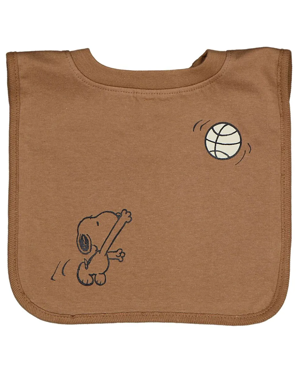 Ce bavoir pour bébé de couleur marron est fabriqué en jersey simple. Sur le devant, il y a un dessin d’un petit chien qui saute vers une balle. Le bavoir a une forme droite et une encolure ronde, ce qui permet de l’enfiler facilement pendant les repas.