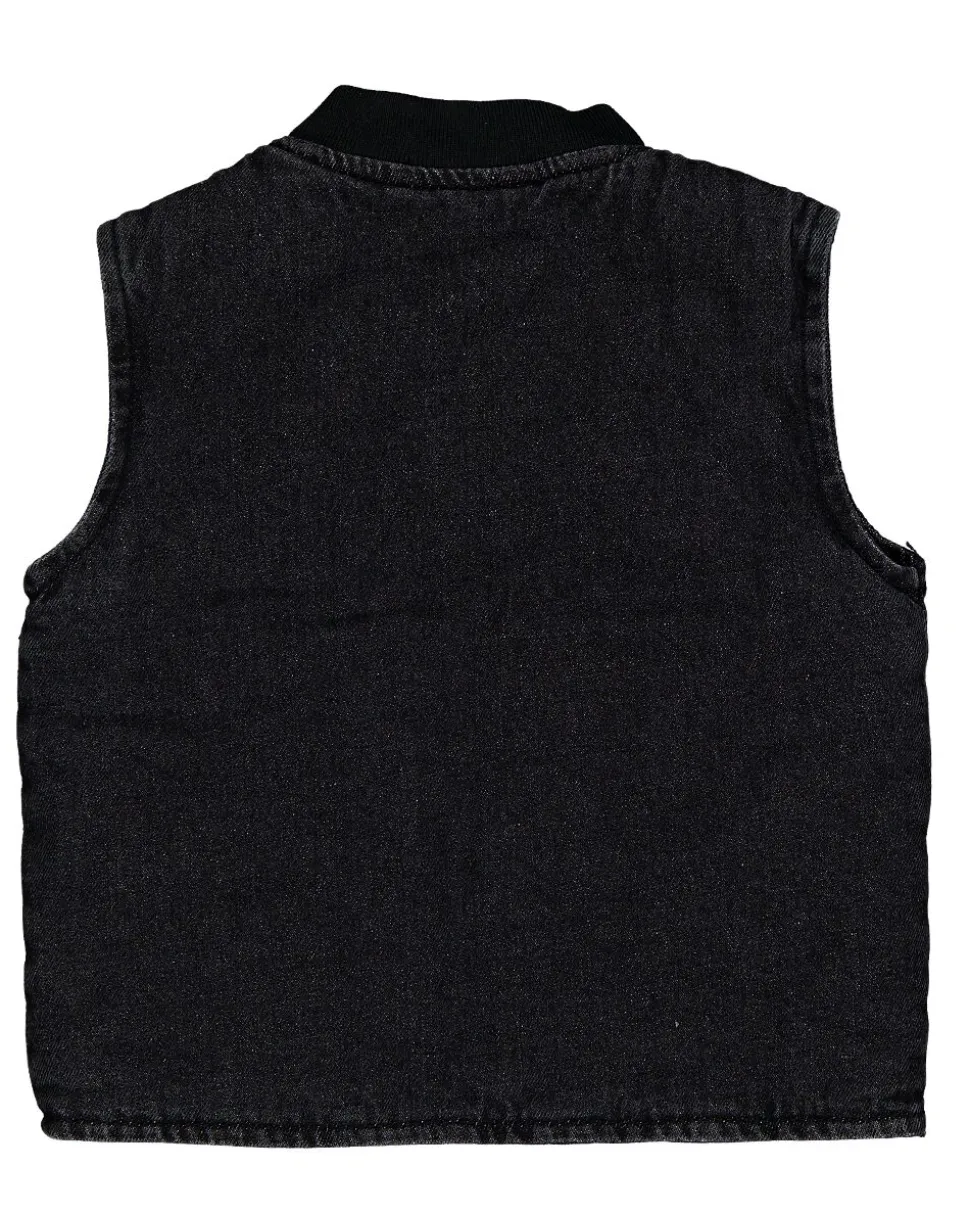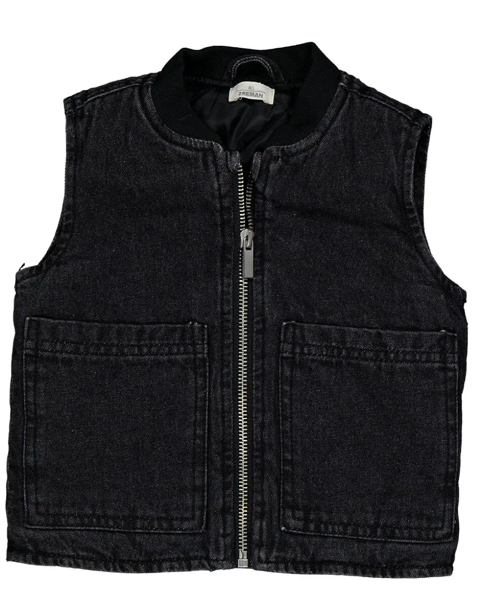 Ce gilet noir est fabriqué en denim 100% coton. Le gilet pour bébé unisexe possède une fermeture éclair sur le devant et deux poches. Grâce à son matériau, il est robuste et offre une protection supplémentaire contre le froid.
