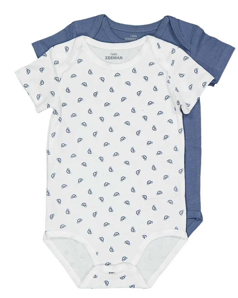 Cet ensemble contient deux bodies pour bébé : un en bleu foncé uni et un blanc avec un motif bleu. Ils sont en 100% coton, ce qui les rend doux et respirants. Les manches courtes et l’encolure ronde assurent un port confortable et permettent une bonne liberté de mouvement. La fermeture n’est pas visible.