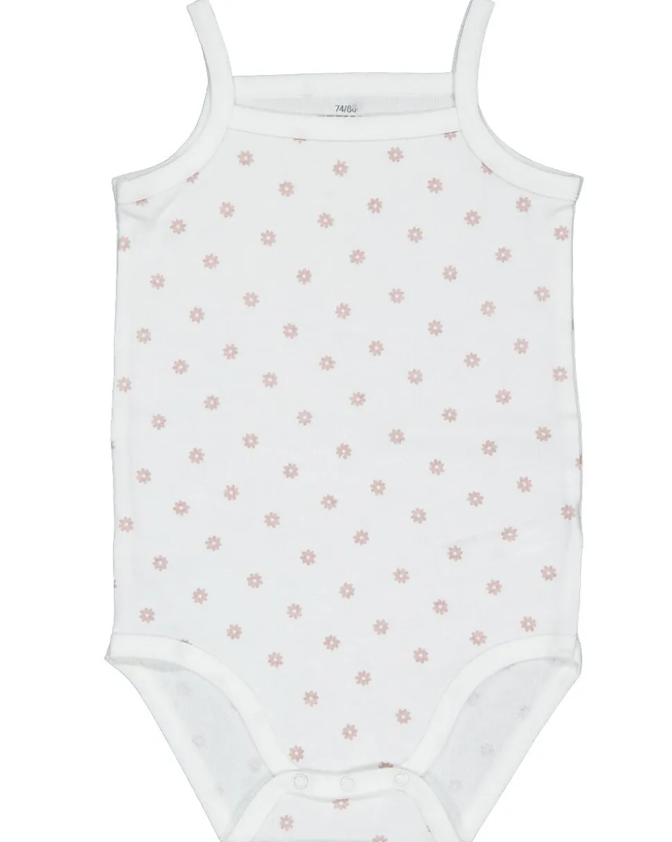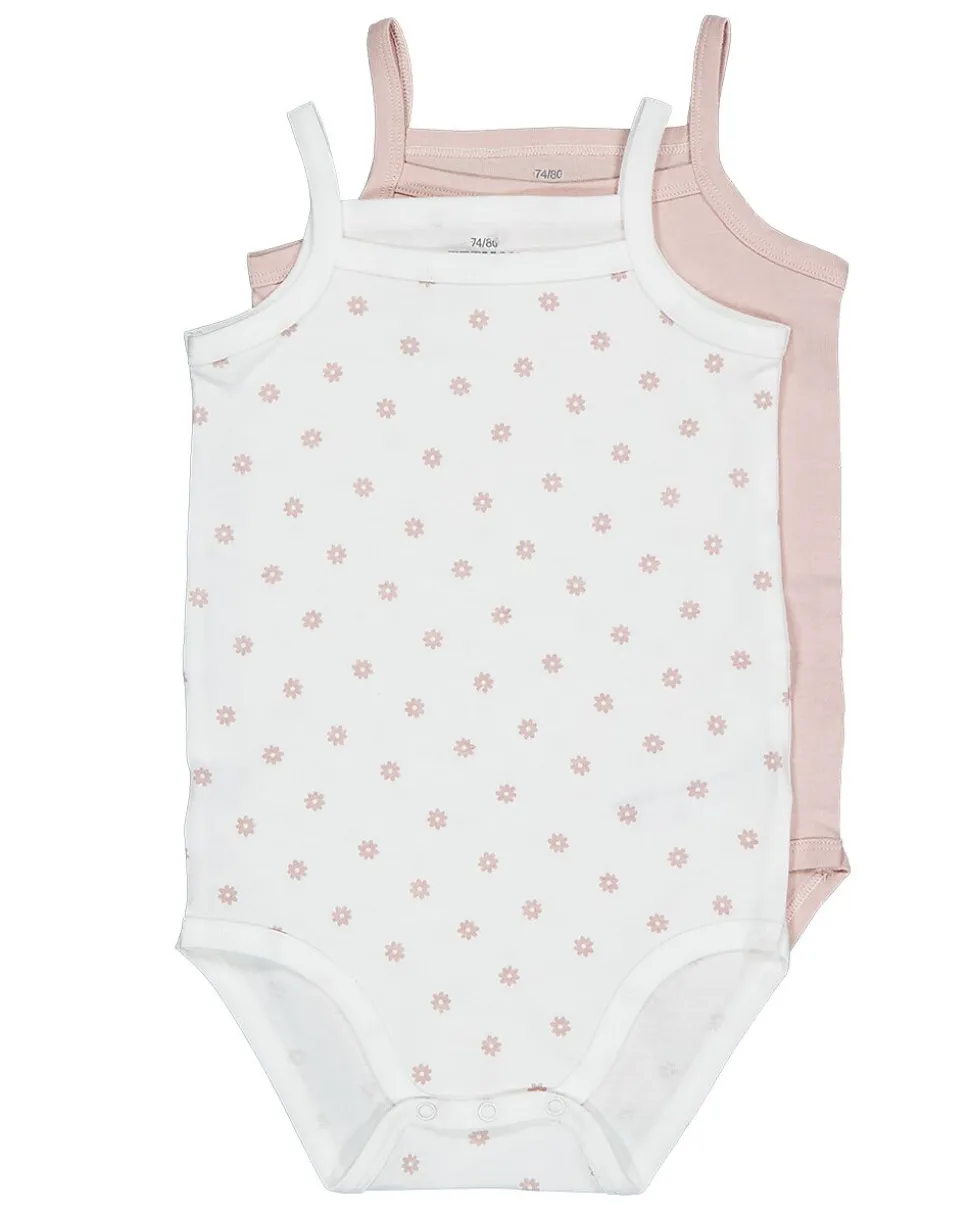 Cet ensemble de deux bodies roses pour bébé est fait en 100 % coton, ce qui rend le tissu doux et respirant sur la peau. Un body est rose uni, l’autre est blanc avec de petits pois roses. Les fines bretelles rendent les bodies légers à porter, ce qui est agréable les jours chauds.