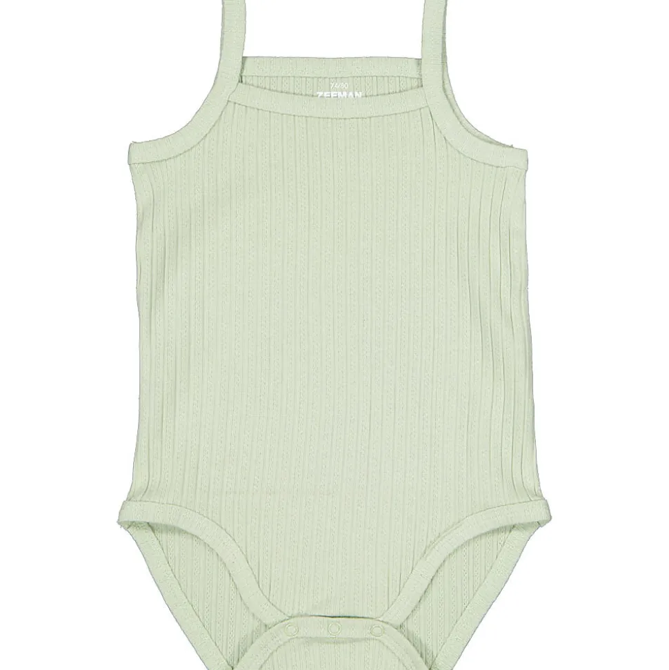 Cette combinaison bébé est fabriquée en 95% coton et 5% élasthanne. Le tissu pointelle est doux et agréable à porter. Elle est sans manches et de couleur vert clair. Une combinaison bébé est un vêtement polyvalent. Elle peut se porter comme sous-vêtement quand il fait plus frais, ou comme vêtement seul pendant les jours plus chauds. Cette combinaison en vert clair reste bien en place grâce à sa forme en une seule pièce. Le dos et le ventre restent couverts, même quand le bébé roule, joue ou rampe, et sa température reste plus stable. Le sous-vêtement, comme la couche, reste aussi mieux en place. Les boutons-pression au bas permettent de l’enfiler et de l’enlever facilement, ce qui est pratique pour changer une couche rapidement. Cette combinaison est sans manches. Cela la rend facile à porter sous presque tous les vêtements, mais aussi seule pendant les journées chaudes. Le tissu est composé de 95% coton et 5% élasthanne. Le coton est un tissu agréable, même pour les jours plus chauds, car il laisse mieux respirer la peau, absorbe l’humidité et sèche rapidement. Il est aussi plus résistant grâce à sa structure. Le tissu est souple et offre davantage d’élasticité grâce à l’ajout d’élasthanne. Cela donne au bébé plus de liberté de mouvement pour rouler, ramper et jouer.