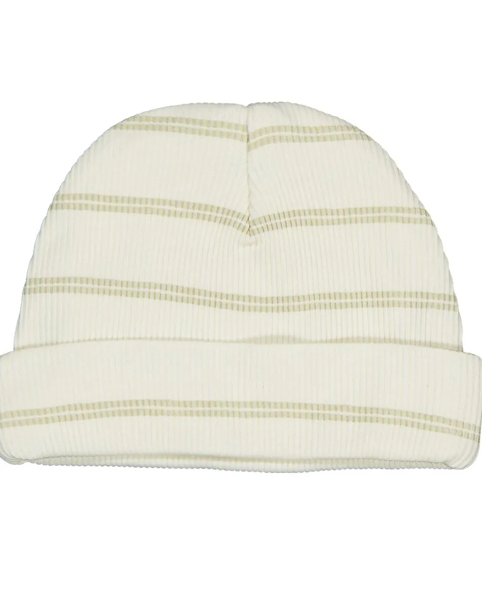 Ce bonnet bébé unisexe beige est confectionné dans une matière douce composée de 48 % coton, 48 % viscose et 4 % élasthanne. Le bonnet présente un fin motif côtelé avec de subtiles rayures horizontales dans une teinte plus claire. Le revers assure un ajustement confortable. Idéal pour garder la tête de votre bébé bien au chaud lors des journées plus fraîches.