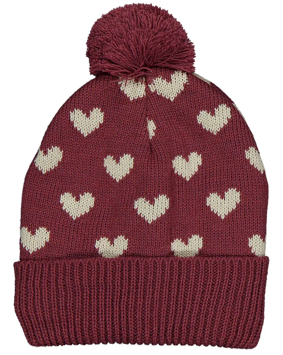 Ce bonnet a un motif rouge et blanc avec des cœurs et un grand pompon. Le tissu tricoté est solide et garde la tête bien au chaud par temps froid. Le revers s’ajuste bien et permet au bonnet de rester confortablement en place. Pratique pour un usage quotidien à l’extérieur quand il fait plus froid. Agréable à porter quand il fait frais.