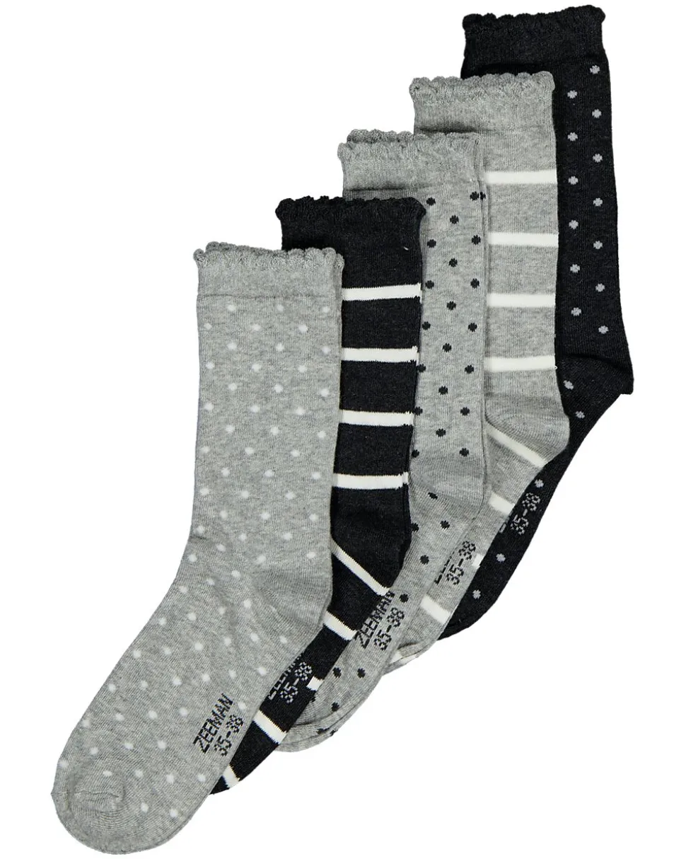 Ce lot de 5 chaussettes pour femme présente différents motifs en gris et noir, comme des pois et des rayures. Elles sont fabriquées en coton, polyester et élasthanne, ce qui les rend douces et légèrement extensibles. Les bords élastiques tiennent bien autour de la cheville, pour que les chaussettes restent en place dans vos chaussures pendant la journée.