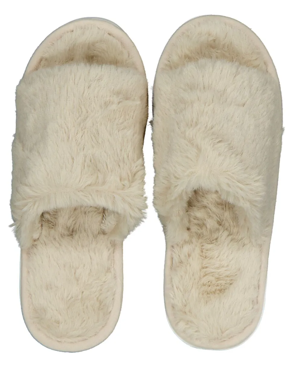 Ces pantoufles pour femme ont un talon ouvert et une large bande sur le cou-de-pied. L’extérieur est entièrement recouvert d’un tissu doux et duveteux. La couleur claire donne un aspect calme. Grâce à leur forme ouverte, elles sont faciles à enfiler et à retirer. Idéales à porter à la maison pour plus de confort et pour garder les pieds au chaud sur un sol froid.