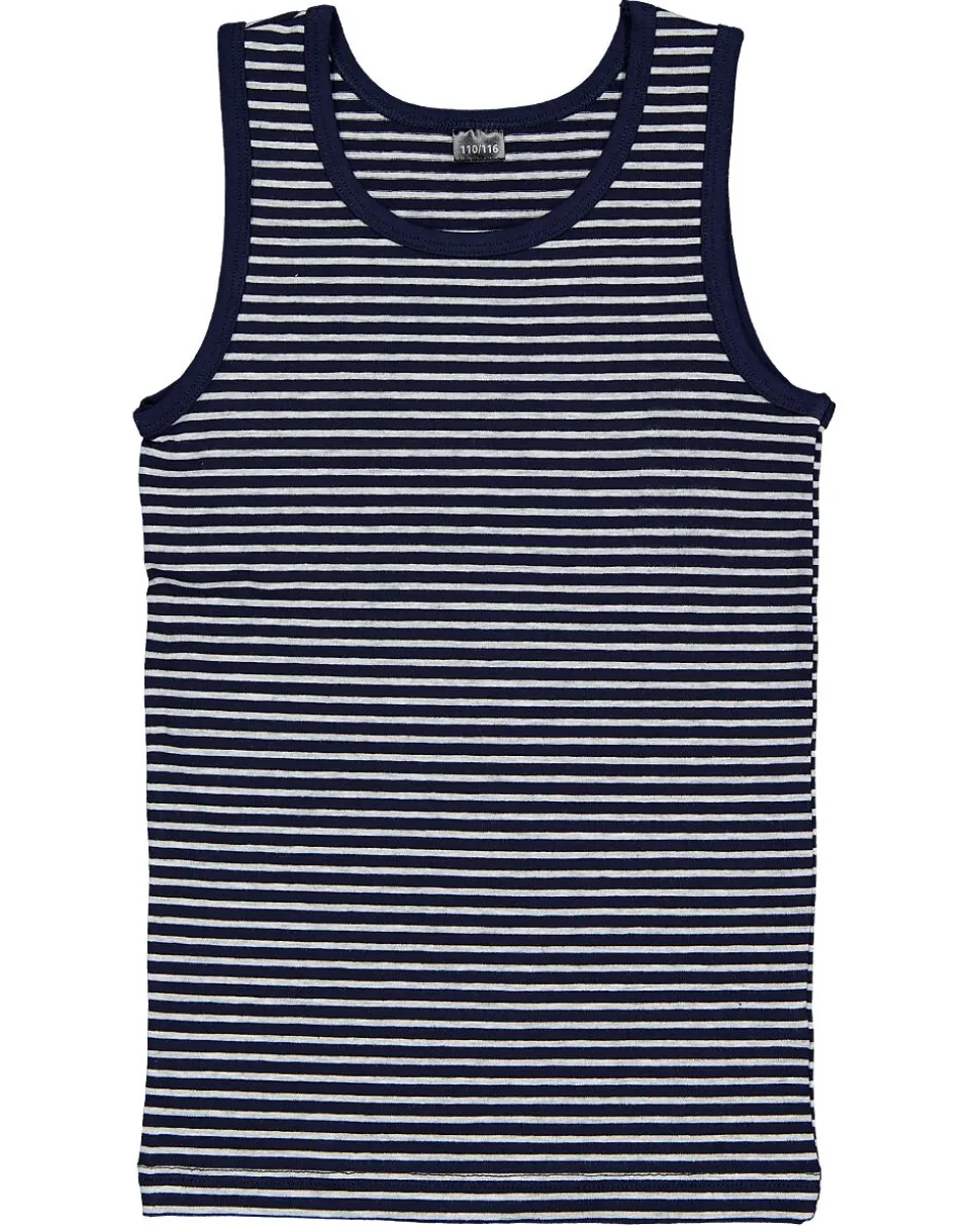 Ce débardeur pour garçon a des rayures bleu foncé et blanches et n’a pas de manches. L’encolure ronde et les emmanchures sont finies avec un bord côte bleu foncé, ce qui permet au débardeur de bien rester en place. Le tissu est composé de coton avec un peu d’élasthanne, ce qui le rend doux et souple. Il se porte confortablement sous les vêtements ou simplement seul les jours chauds.