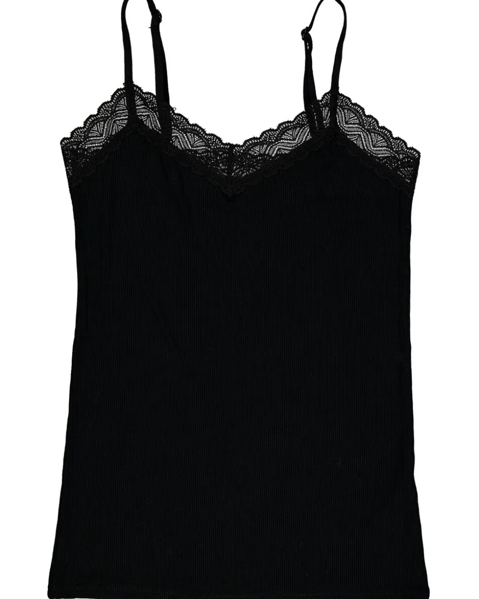 Ce débardeur noir pour femme présente de fines bretelles et un col V avec finition en dentelle. Grâce à sa texture côtelée, le débardeur épouse bien le corps et offre un confort optimal sous vos vêtements. Le tissu est composé de viscose et d’élasthanne, ce qui le rend doux et légèrement extensible.