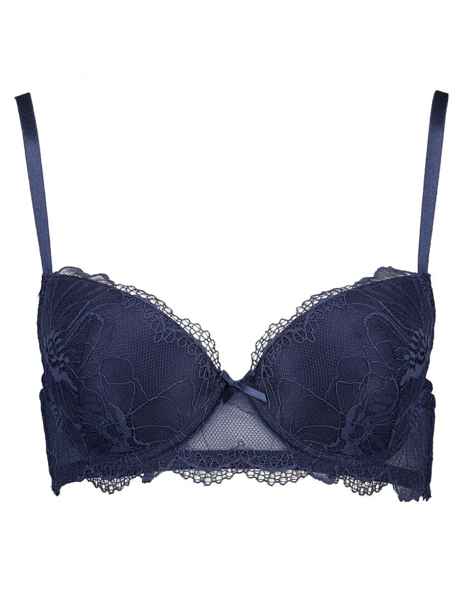 Ce soutien-gorge rembourré pour femmes est fait en dentelle bleu foncé avec un motif floral. Les bretelles sont réglables et les bonnets sont légèrement rembourrés pour plus de confort. La doublure est douce et il y a un petit nœud entre les bonnets. La bande sous la poitrine offre un bon maintien. Ce soutien-gorge convient pour un usage quotidien.