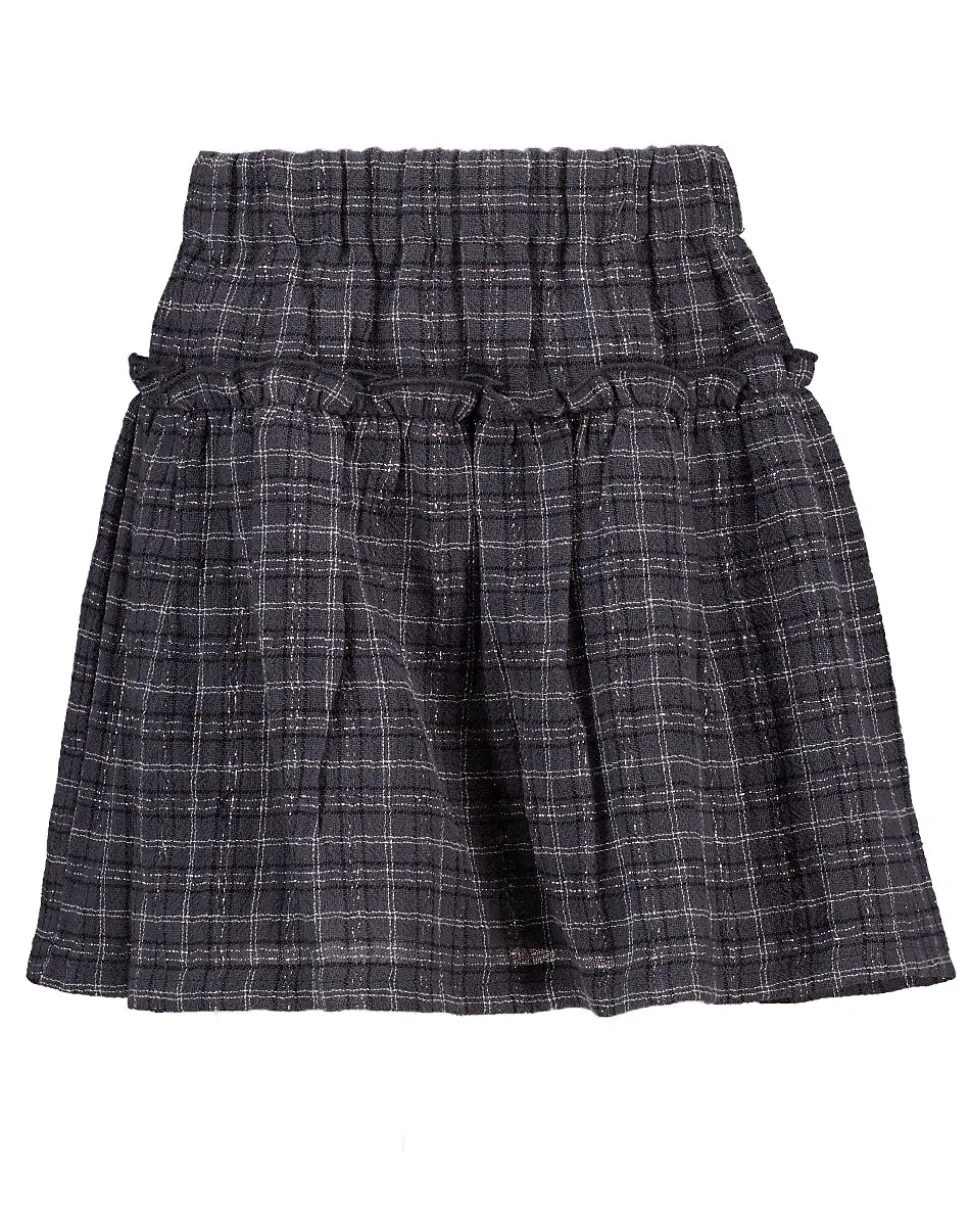 Cette jupe noire pour fille a un motif à carreaux avec une légère brillance. Elle est faite en coton avec un peu de fil métallique et de polyester pour la solidité et un effet discret. La large ceinture élastique assure un bon maintien. Grâce à la doublure douce, la jupe est agréable à porter.
