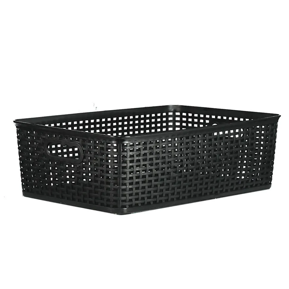 Ce panier de rangement noir a une structure ouverte et tressée et une forme rectangulaire. Les poignées sur les côtés permettent de le soulever et de le déplacer facilement, pour ranger quelque chose rapidement. Sa forme basse et large offre une bonne vue d’ensemble, ce qui permet de garder les petits objets bien ensemble dans une armoire, un tiroir ou le salon.