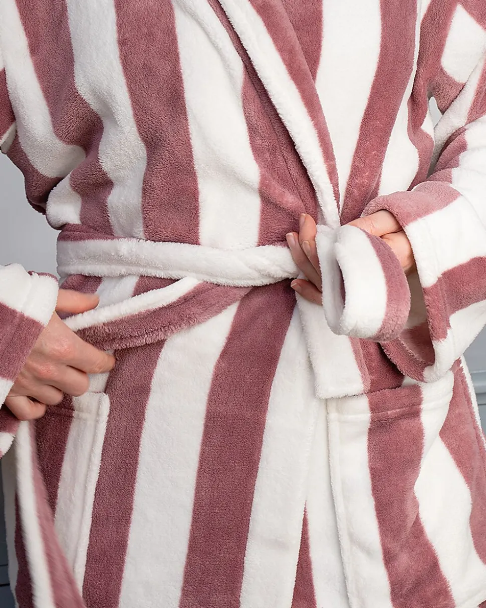 Ce peignoir présente de larges rayures roses et blanches. Fabriqué en polaire toucher peluche tout doux, une matière agréable sur la peau. Le col châle apporte un confort supplémentaire. Avec une ceinture à nouer à la taille et deux poches pratiques sur le devant. Grâce à son design simple, ce peignoir est idéal après la douche ou pour se détendre à la maison.