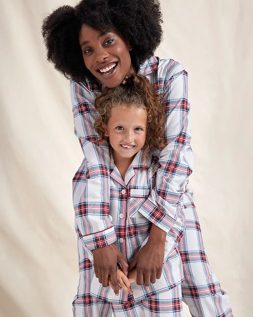 Ce pyjama en flanelle pour femme est fabriqué en 100 % coton. Le tissu est doux et vous tient bien chaud pendant la nuit. Le pyjama présente un motif à carreaux blanc, rouge, bleu et noir. Le haut possède des manches longues, une poche poitrine et se ferme à l’aide de boutons. Le pantalon est doté d’une taille élastiquée et de longues jambes droites. Confortable pour la maison, idéal pour les nuits froides.