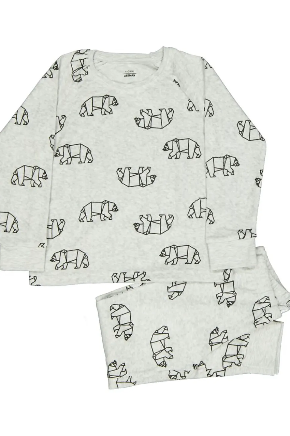 Ce pyjama gris pour garçon est fabriqué en velours doux. L’ensemble comprend un pull à manches longues et un pantalon long. Le tissu est imprimé de motifs d’ours noirs et blancs, ce qui donne au pyjama un aspect ludique. Grâce à l’encolure ronde et aux matières douces, ce pyjama est confortable. Votre enfant peut ainsi bien dormir ou se détendre à la maison.