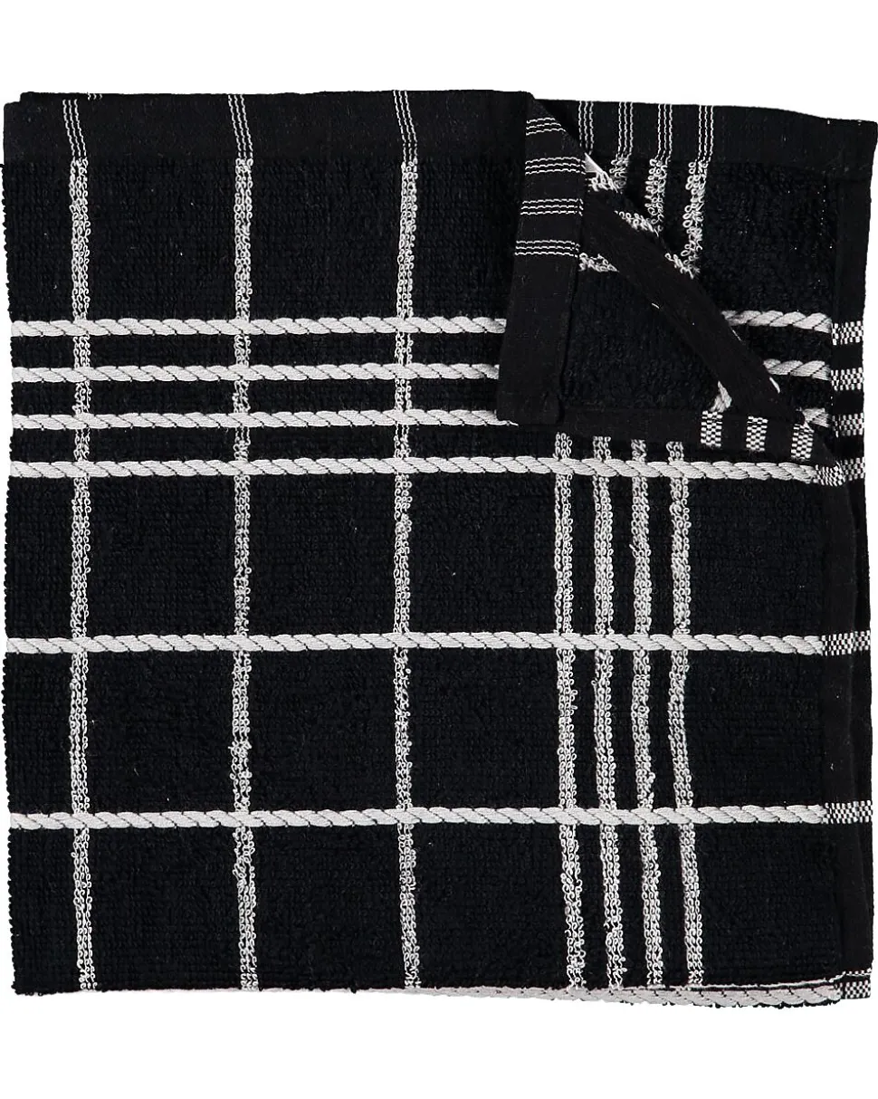 Avec ce torchon noir, vous essuyez rapidement vos mains ou votre plan de travail. Il est fabriqué en coton résistant. Le torchon mesure 50 x 50 cm et présente un motif à carreaux blancs. Il s’accroche facilement grâce à sa boucle de suspension résistante. Sa couleur neutre lui permet de s’intégrer parfaitement dans toutes les cuisines.