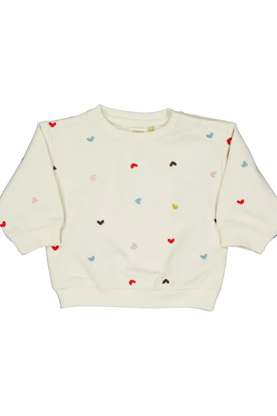 Ce sweat beige pour bébé est fabriqué en molleton doux. Le sweat présente de petits cœurs de différentes couleurs, ce qui lui donne un aspect joyeux et ludique. L’encolure ronde et les bords-côtes sont confortables et permettent à votre bébé de bouger facilement. Le tissu souple rend ce sweat facile à enfiler et à enlever, ce qui est pratique pour changer votre bébé.