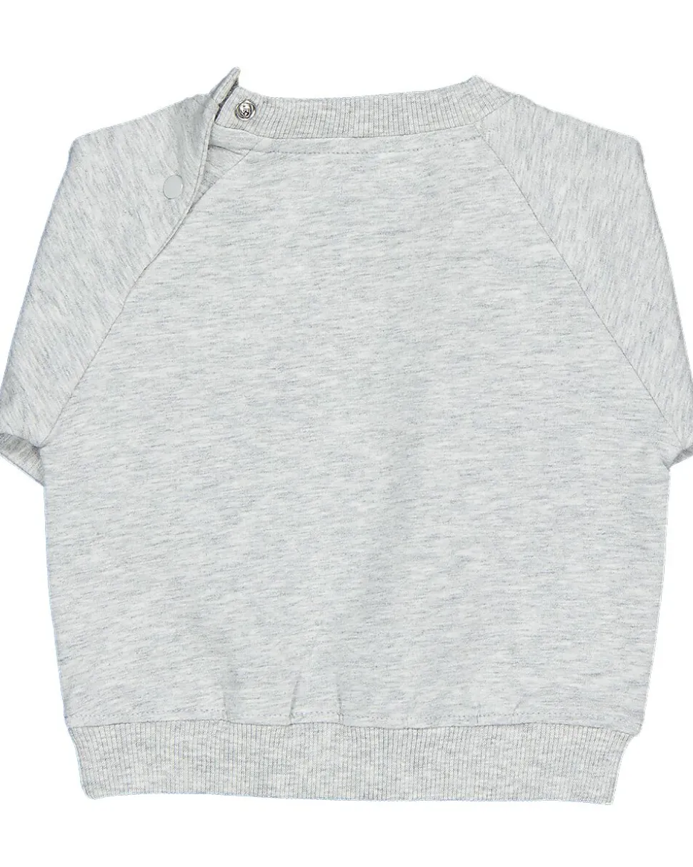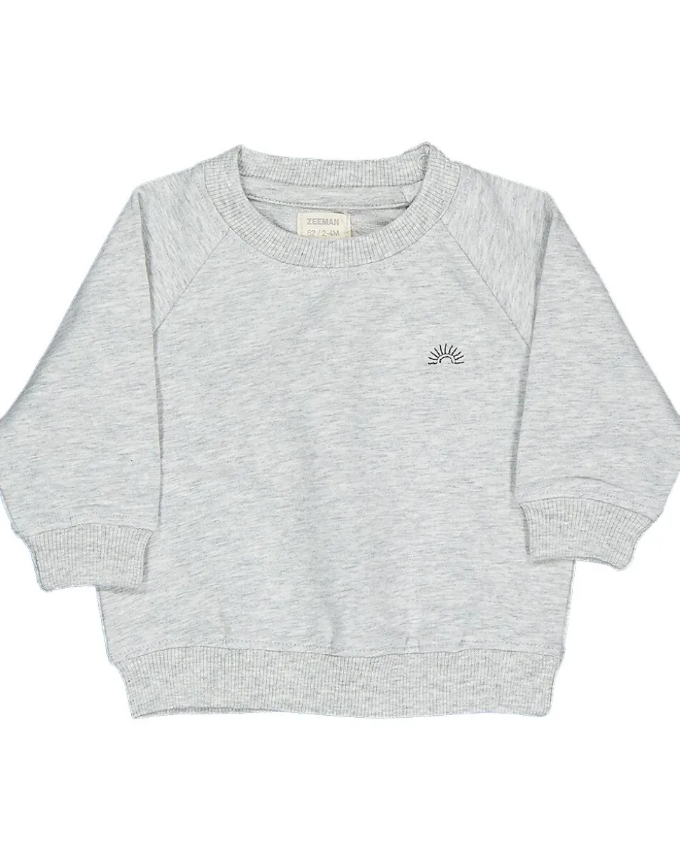 Ce sweat gris pour bébé a des manches longues et un col rond. Le tissu souple et uni permet à votre bébé de bouger facilement. Un petit motif discret se trouve sur la poitrine. Les bords légèrement élastiques tiennent bien en place, ce qui rend le vêtement confortable à porter. Grâce à sa couleur neutre, ce sweat se combine facilement avec d’autres vêtements.