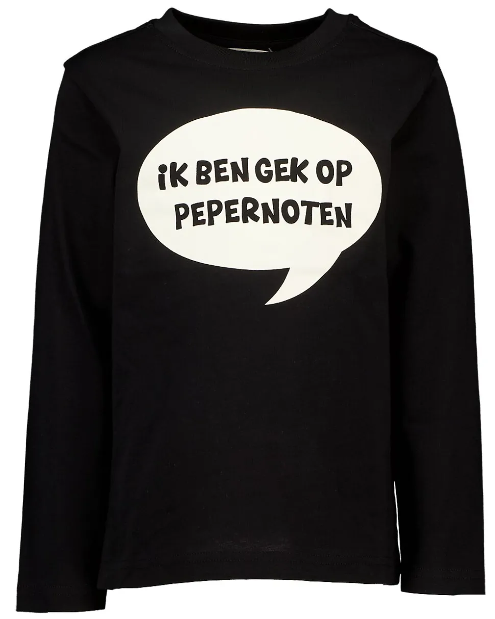 Ce T-shirt noir à manches longues est en 100% coton et est donc agréable sur la peau. À l’avant, il y a une bulle de texte blanche avec le message « Ik ben gek op pepernoten ». L’encolure droite et la finition simple conviennent aux garçons et aux filles qui aiment le confort et un look joyeux.