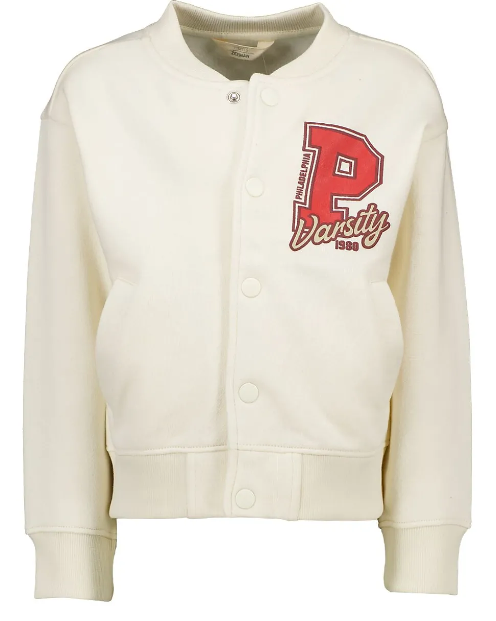 Ce gilet beige pour fille est en polaire tricotée et a des manches longues. Il se ferme devant avec des boutons-pression et comporte une grande impression rouge avec la lettre P et le mot « Varsity ». L’encolure, les manches et le bas sont finis avec un bord large pour plus de confort. Pratique à enfiler rapidement sur un t-shirt ou un pull.