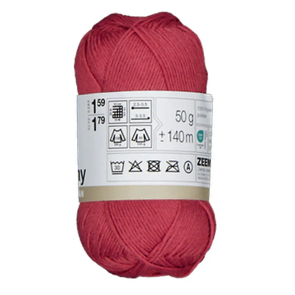Ce fil à crocheter Amy rouge est composé à 100 % de polyester et pèse 50 grammes par pelote. Le fil est résistant et souple, ce qui le rend agréable à crocheter et à tricoter. Un échantillon de 10 x 10 cm représente 16 mailles et 30 rangs. Convient pour des crochets de 3-3,5 mm et aiguilles à tricoter de 2,5-3,5 mm. Vous avez acheté une pelote de trop ? Rapportez-la-nous dans un délai d’un an en présentant votre ticket de caisse et nous vous rembourserons.