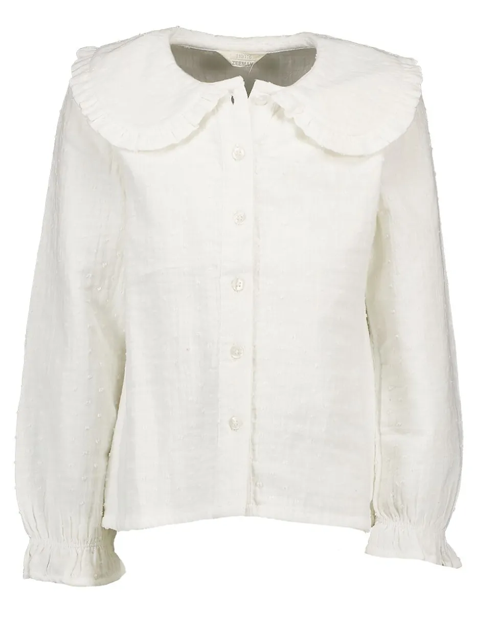 Cette blouse blanche pour filles est en 100% coton. Elle a des manches longues avec des volants aux extrémités et une fermeture boutonnée à l’avant. Le grand col arrondi donne un côté ludique. Le coton est doux sur la peau, ce qui rend la blouse confortable toute la journée.