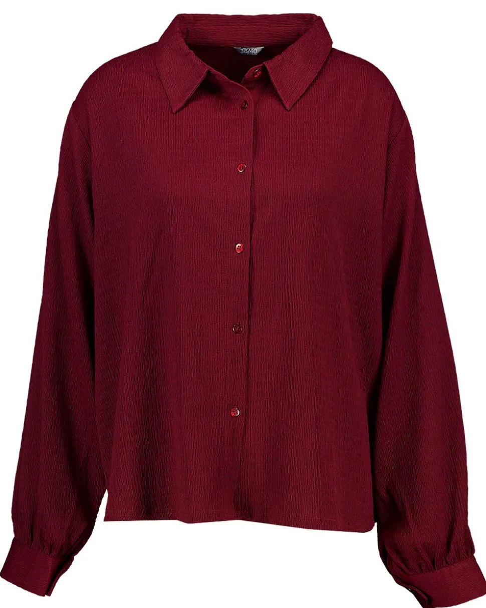 Cette blouse pour femme est d’un rouge profond. Elle a un col, des manches longues avec une fermeture à bouton au poignet et une rangée de boutons sur le devant. Le tissu souple offre un ajustement confortable. Son design simple rend cette blouse adaptée à différentes occasions.