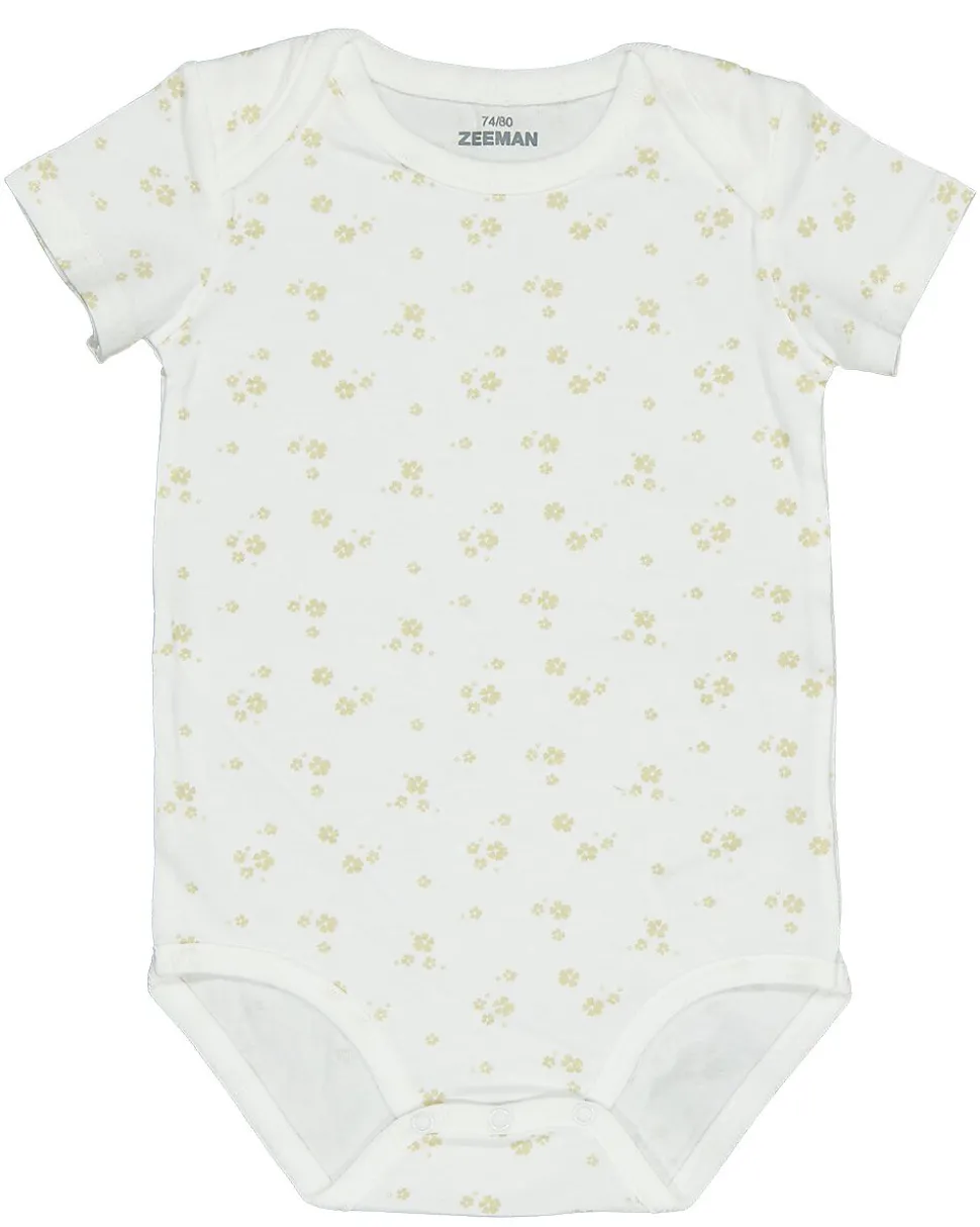Cet ensemble se compose de deux bodies pour bébé : un beige et un blanc avec un motif floral beige discret. Ils sont en coton, ce qui les rend doux pour la peau. Les manches courtes et le tissu souple permettent de bouger facilement, pour rester à l’aise en position couchée ou en jouant.