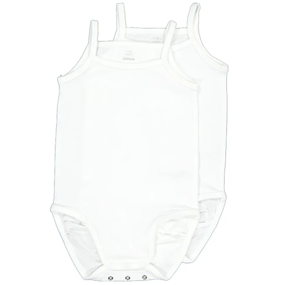 Ces bodies blancs sont faits en coton avec un peu d’élasthanne, ce qui rend le tissu doux et légèrement extensible. Les fines bretelles et les boutons-pression en bas permettent d’enfiler et d’enlever le body facilement. Le modèle est léger et agréable à porter, pour que votre bébé reste à l’aise même quand il fait chaud. Vous recevez un lot de deux bodies pour bébés.
