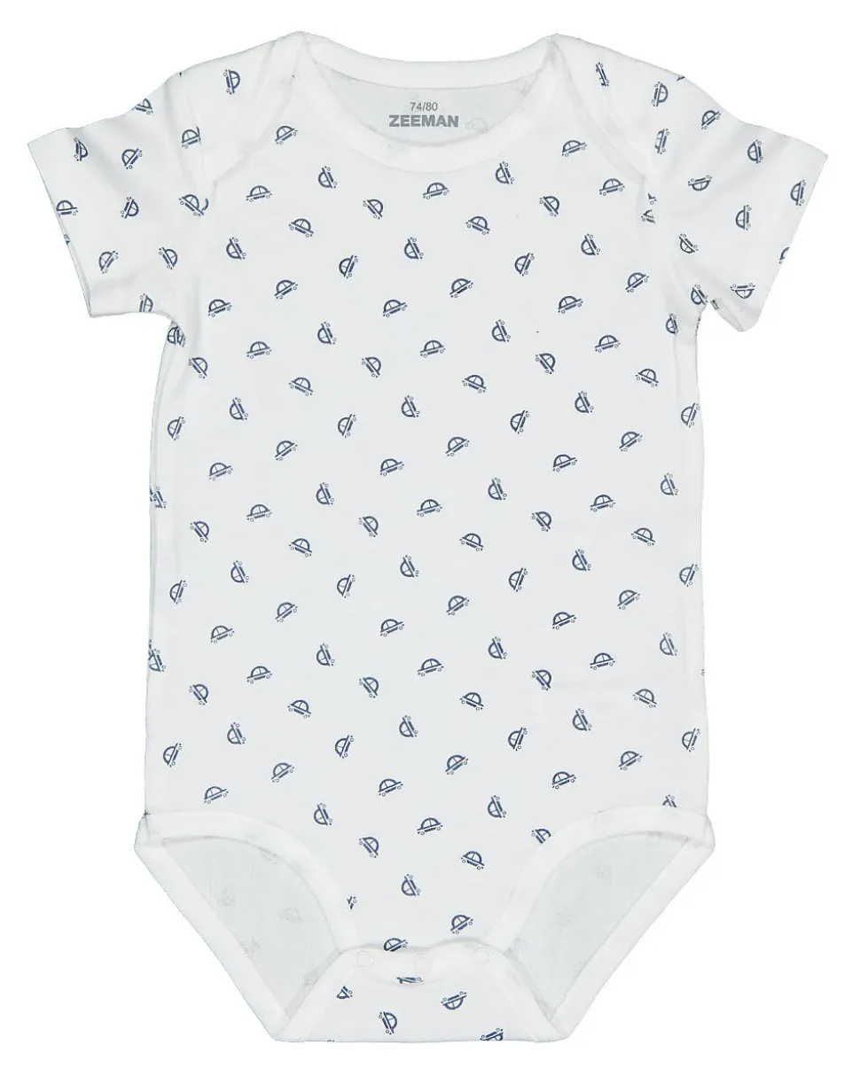 Cet ensemble contient deux bodies pour bébé : un en bleu foncé uni et un blanc avec un motif bleu. Ils sont en 100% coton, ce qui les rend doux et respirants. Les manches courtes et l’encolure ronde assurent un port confortable et permettent une bonne liberté de mouvement. La fermeture n’est pas visible.