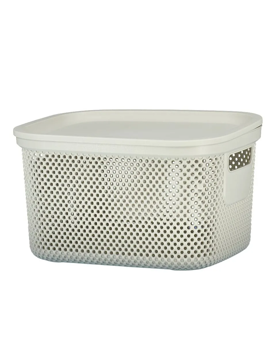 Cette boîte de rangement grise a un couvercle solide et un motif perforé sur les côtés. Elle est faite en polypropylène robuste, ce qui permet d’y ranger facilement différentes affaires. Son design neutre convient à chaque pièce de la maison, pour garder votre armoire ou votre chambre bien ordonnée.