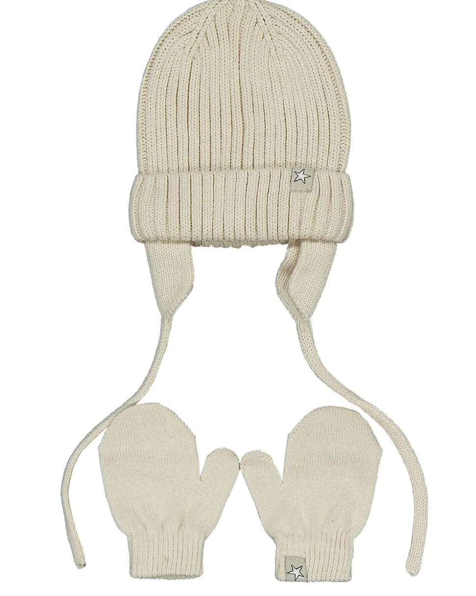 Cet ensemble blanc de deux pièces pour bébé comprend un bonnet tricoté avec des cache-oreilles et des liens, pour pouvoir l’attacher fermement et le garder bien en place. La structure côtelée est douce et souple. Les moufles ont le même aspect tricoté et s’ajustent bien, pour que les petites mains restent au chaud lors des moments frais à l’extérieur.