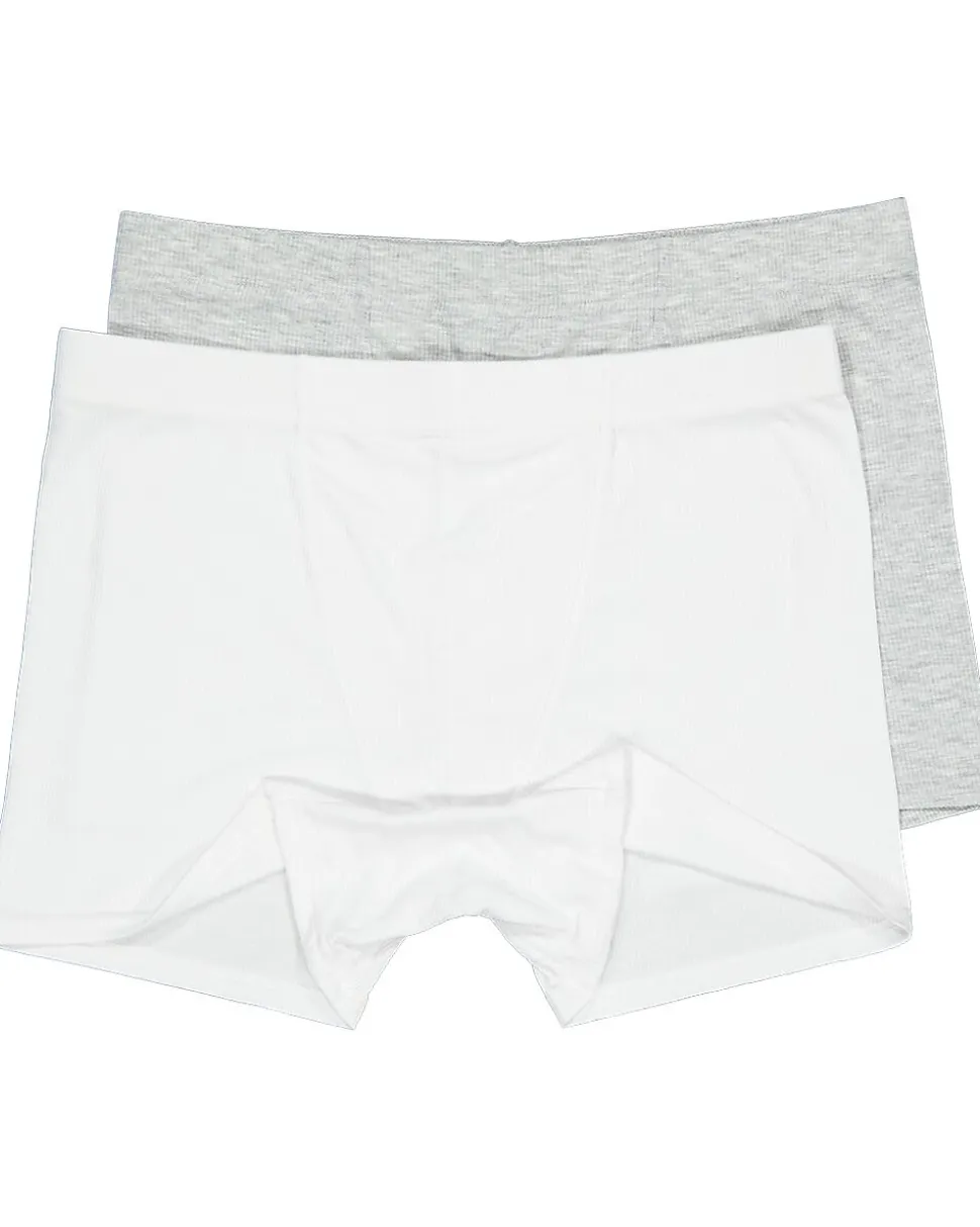 Ces boxers pour femme sont déclinés en blanc et gris clair. Ils sont vendus par lot de deux. Ils présentent une texture côtelée douce et une large taille élastiquée, offrant un bon maintien et une liberté de mouvement agréable. Le tissu est composé de viscose et d’élasthanne, pour des boxers souples au toucher.