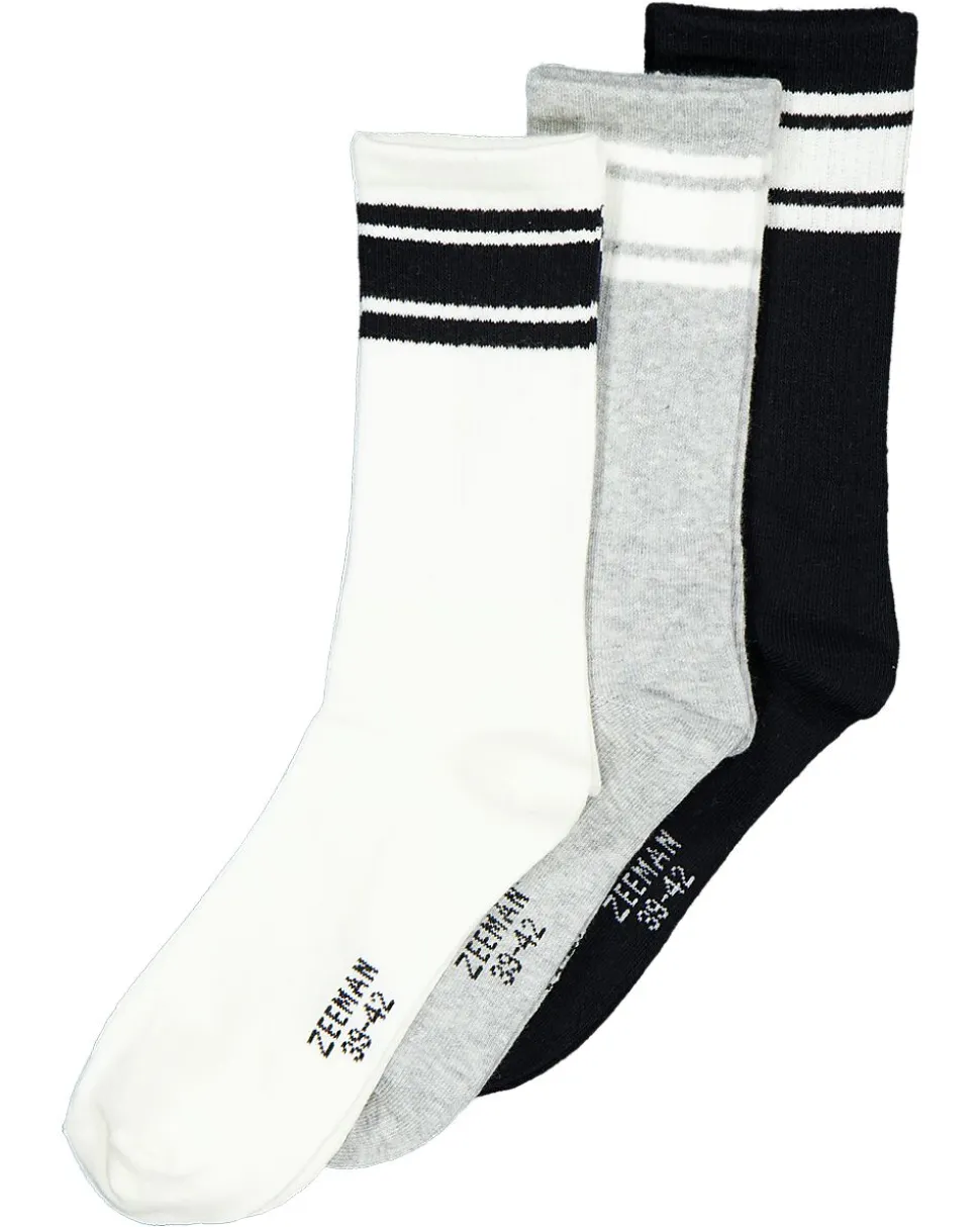 Ces chaussettes pour homme sont vendues par trois, en blanc, gris et noir, avec deux bandes en haut. Le mélange de coton, polyester et fibres élastiques rend la matière douce et extensible, pour qu’elles s’adaptent bien à votre pied. La tige plus haute apporte un bon maintien autour de la cheville, ce qui permet aux chaussettes de rester en place lorsque vous marchez ou faites du sport.
