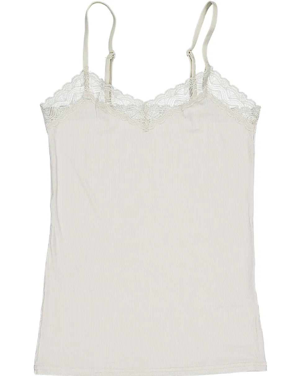 Ce débardeur beige pour femme a des bretelles réglables, ce qui permet d’ajuster facilement la coupe. La finition en dentelle le long de l’encolure lui donne un aspect soigné. Le tissu est composé de coton avec un peu d’élasthanne, ce qui le rend doux et légèrement extensible. Grâce à sa couleur unie, vous pouvez facilement le porter sous un pull ou une blouse.