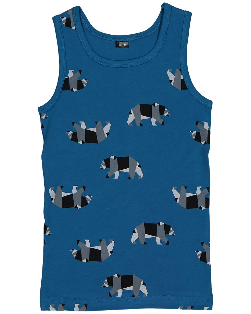 Ce débardeur pour garçon est composé à 95 % de coton et à 5 % d’élasthanne. Le tissu est doux et offre beaucoup de confort et de liberté de mouvement. Le débardeur à col rond est bleu avec un imprimé d’animaux stylisés. Agréable à porter sous un tee-shirt ou comme haut léger lorsqu’il fait chaud.