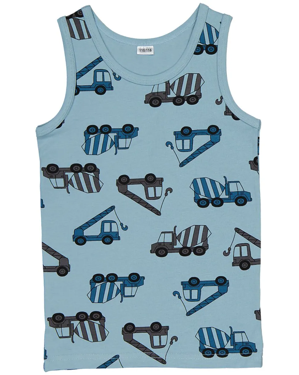 Ce débardeur pour garçon de couleur bleue arbore un imprimé de différents engins de construction en gris et bleu foncé. Il est fabriqué en coton avec une touche d’élasthanne, ce qui le rend agréablement extensible. Les manches sont non finies, offrant ainsi un modèle estival et aéré. Portez-le lors des journées chaudes ou comme couche supplémentaire.