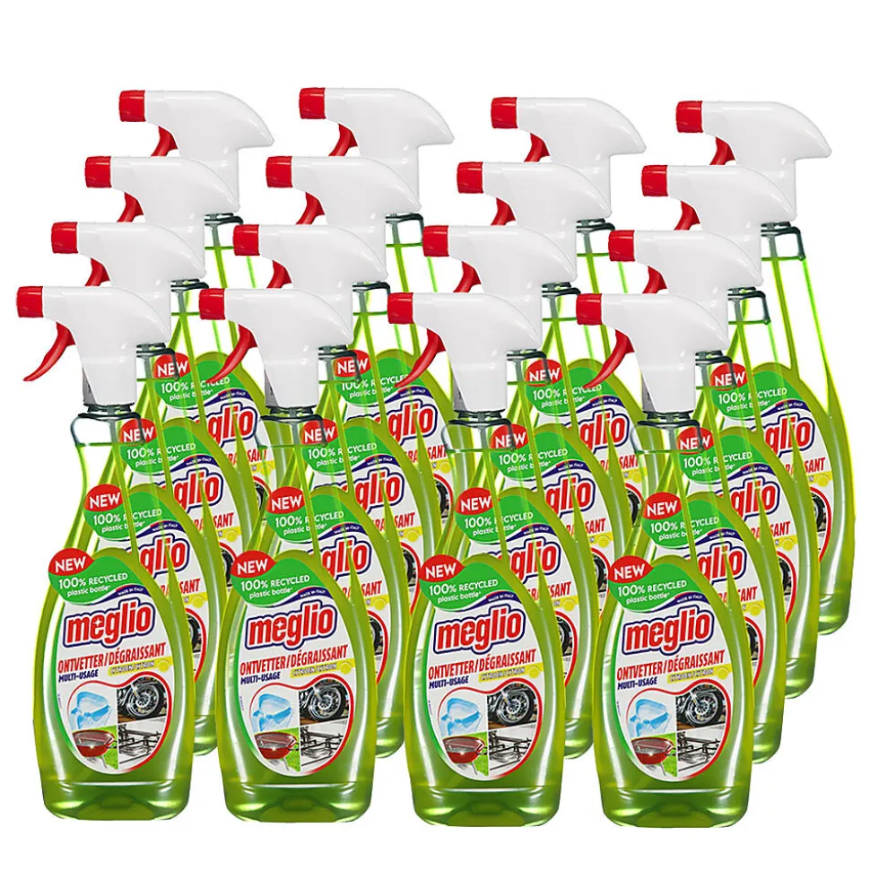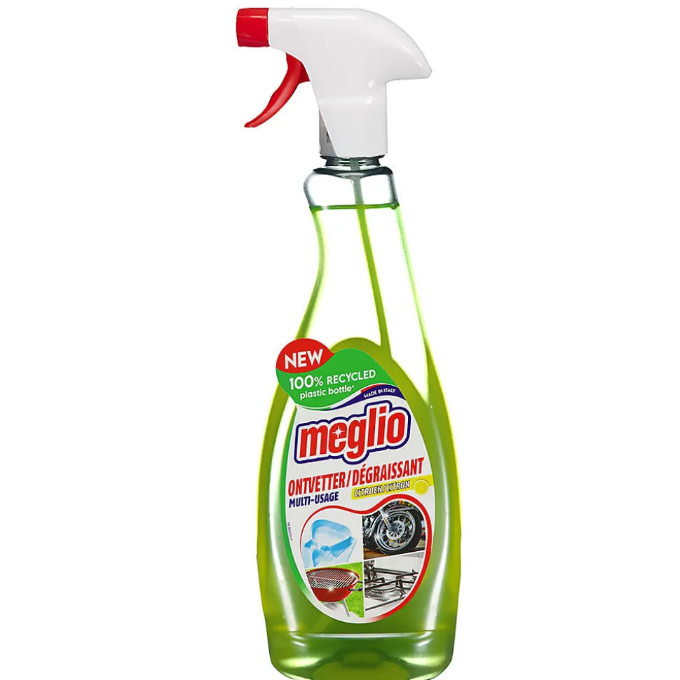 Ce dégraissant Meglio vous permet de nettoyer très facilement les surfaces les plus difficiles : friteuses grasses, grilles de barbecue, chaînes de vélo, volets roulants, mobilier de jardin ou jantes de voiture. Une petite quantité de produit suffit en général. C’est également un détachant parfait pour les meubles et les vêtements. Le dégraissant laisse un parfum frais de citron et son vaporisateur permet de l’appliquer facilement sur les surfaces verticales.