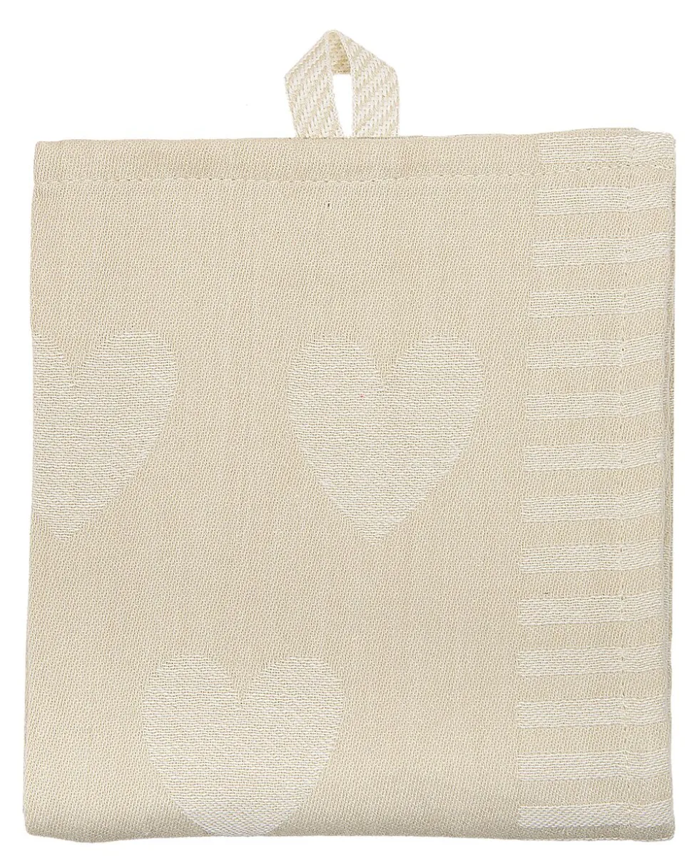 Ce torchon beige est fabriqué en 100% coton et a une structure tissée avec un motif discret de petits cœurs et des rayures sur le côté. Grâce à sa bonne absorption, vous séchez facilement la vaisselle ou le plan de travail. Avec la boucle d’accrochage, vous le suspendez simplement dans la cuisine, pour l’avoir toujours à portée de main.