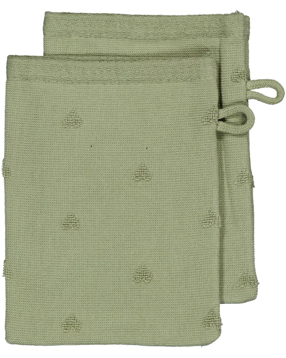 Cet ensemble contient deux gants de toilette verts avec de petits cœurs tissés. Grâce à la petite boucle, vous pouvez accrocher le gant facilement pour qu’il sèche vite dans la salle de bains. Ainsi, vous l’avez toujours à portée de main.