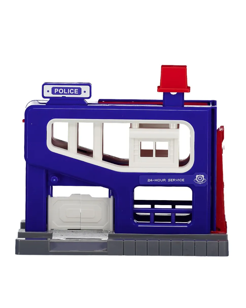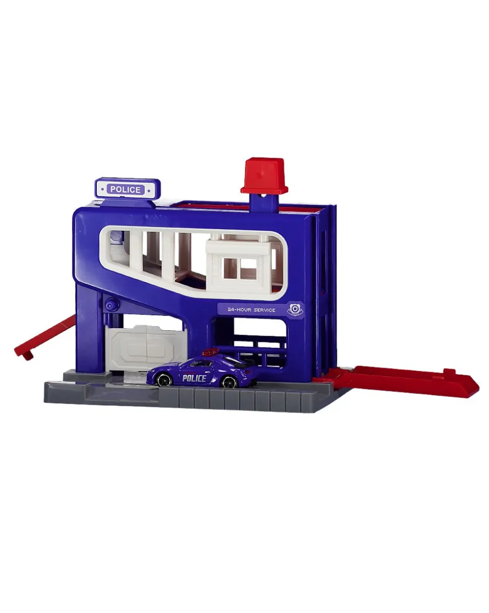 Garage pour jouets avec une base bleue et plusieurs étages. Avec une rampe inclinée, les véhicules peuvent monter et descendre facilement. De l’autre côté, il y a une glissière rouge pour faire descendre rapidement les voitures. Sur le dessus, il y a une petite lumière rouge et au rez-de-chaussée une voiture de police. Convient pour garer des véhicules et les faire rouler. Dimensions : 15,5 x 12 x 18 cm. Poids : 200 grammes.
