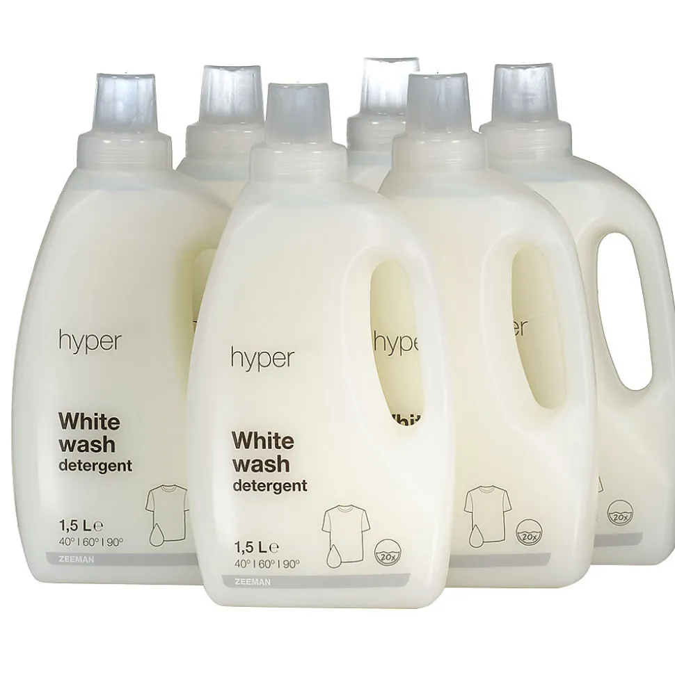 Cette lessive Hyper convient à votre linge blanc et est très bon marché, car nous la faisons fabriquer en très grandes quantités. Le bouchon est refermable et peut également servir de doseur. Il vous permet ainsi de doser la lessive proprement et sans renverser. Un flacon permet environ 20 lavages. Vendue par lot de 6 flacons de 1,5 L. Le prix affiché est à l’unité.
