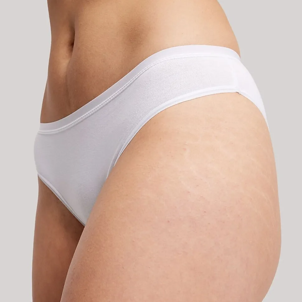 Cette culotte Kim pour femme est blanche et fabriquée dans un tissu doux en coton avec un peu d’élasthanne. Légèrement extensible, elle épouse bien le corps et est confortable à porter sous vos vêtements. Grâce à sa finition lisse, cette culotte reste très discrète. Vous recevrez un lot de trois culottes.