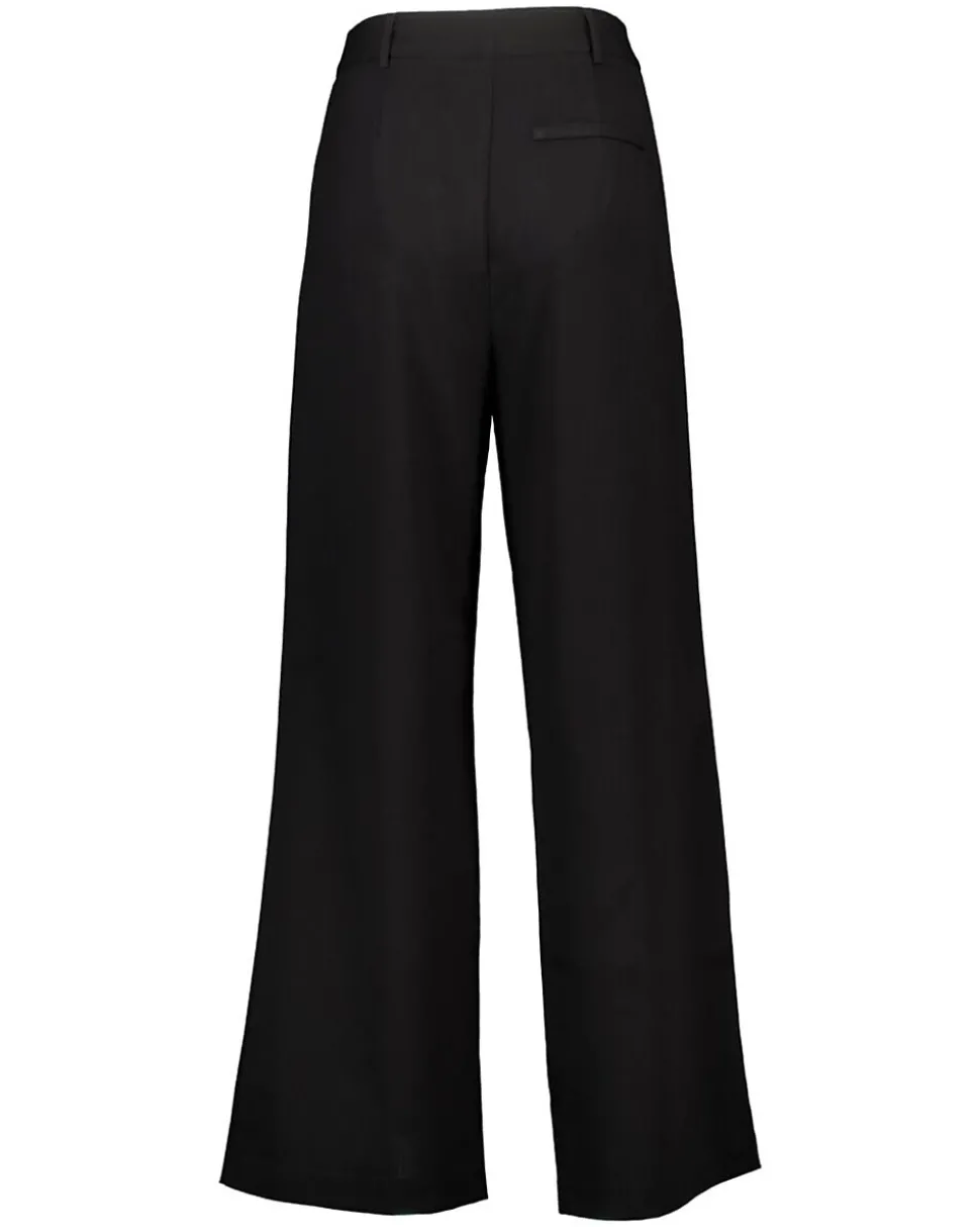 Ce pantalon noir pour femme est doté des jambes larges et se ferme sur le devant par un bouton et un zip, pour un enfilage facile. Le tissu, composé d’un mélange de polyester, viscose et élasthanne, est souple et légèrement extensible, ce qui vous permet de bouger confortablement. Avec son design simple, ce pantalon est adapté à différentes occasions, comme le travail ou les loisirs.