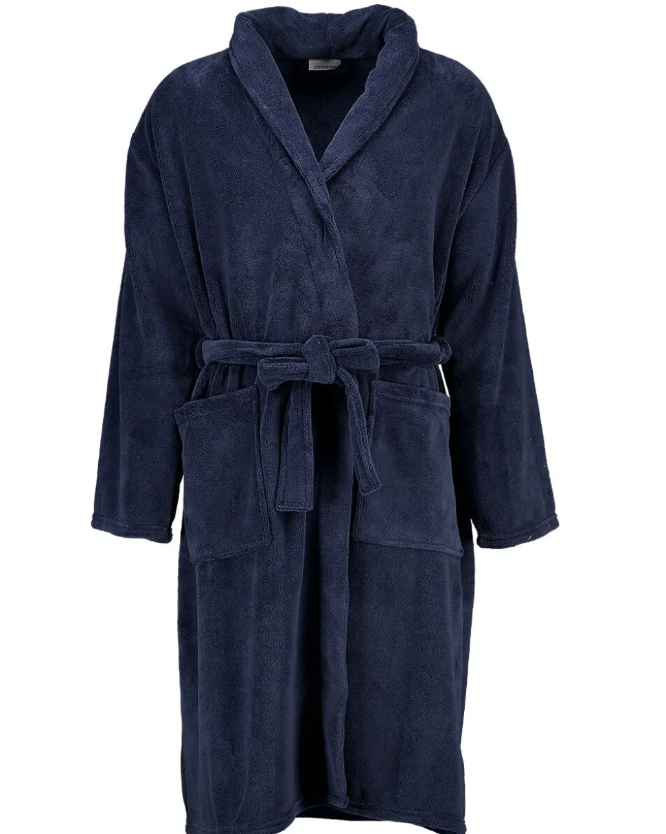 Cette robe de chambre de couleur bleue est fabriquée en polaire corail et composée à 100 % de polyester. La robe de chambre est munie d’une ceinture et de poches à l’avant. La matière douce offre un confort supplémentaire lors du port après le bain ou la douche.