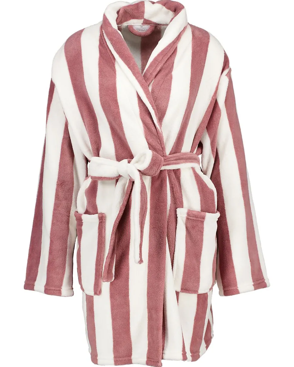 Ce peignoir présente de larges rayures roses et blanches. Fabriqué en polaire toucher peluche tout doux, une matière agréable sur la peau. Le col châle apporte un confort supplémentaire. Avec une ceinture à nouer à la taille et deux poches pratiques sur le devant. Grâce à son design simple, ce peignoir est idéal après la douche ou pour se détendre à la maison.
