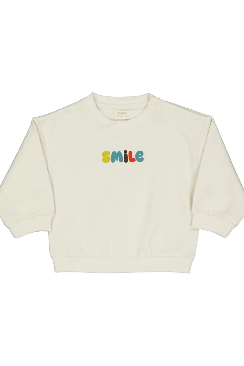 Ce sweat beige pour bébé est en french terry doux et a des manches longues. Le mot « smile » en lettres colorées donne un aspect joyeux. L’encolure ronde et les bords aux manches et à la base sont bien ajustés pour que le pull soit confortable à porter. Convient pour un usage quotidien.