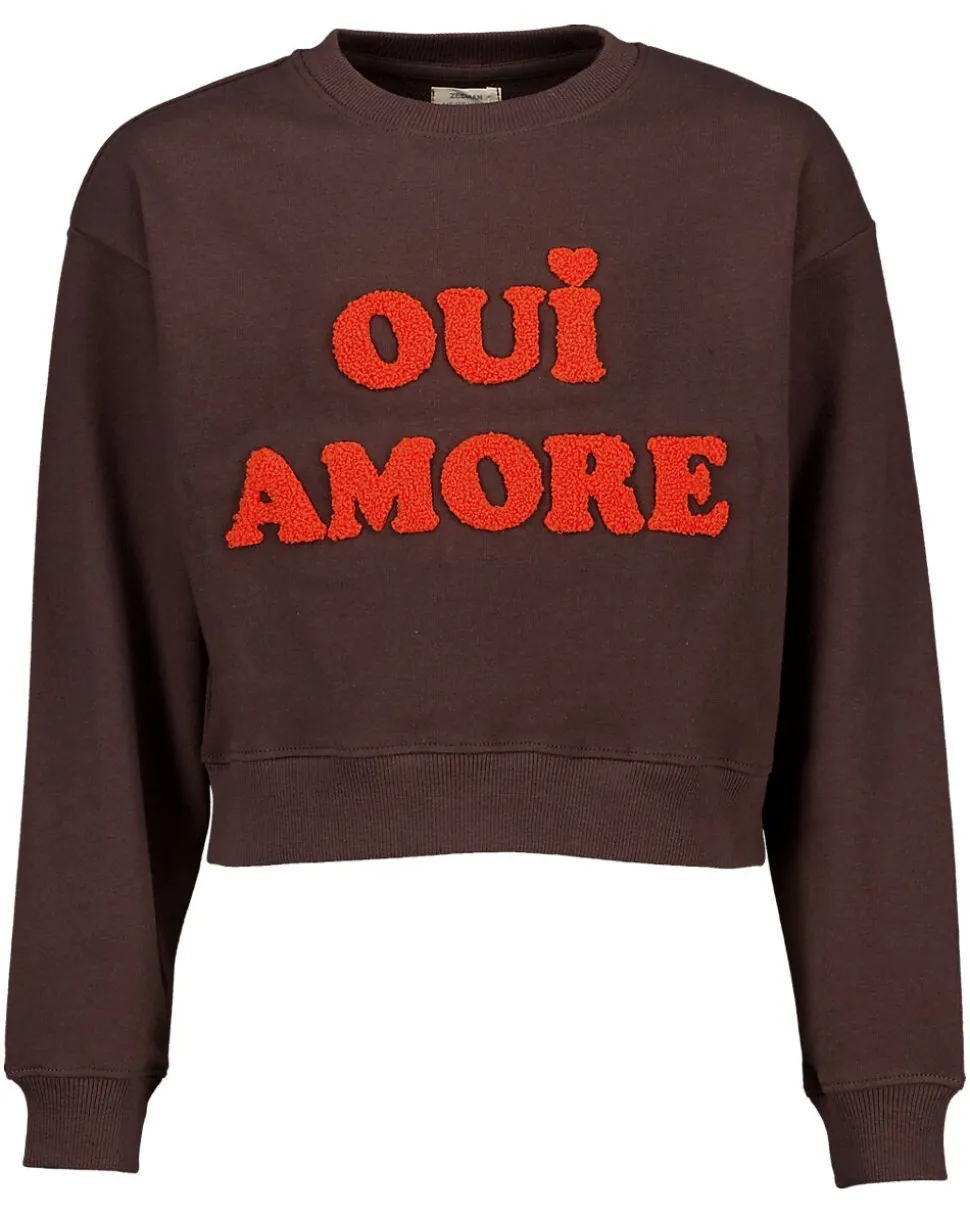 Ce sweat-shirt marron pour fille a des lettres rouges voyantes avec le texte ‘OUI AMORE’ sur le devant. Le sweat-shirt est en french terry et a des manches longues, ce qui le rend doux et agréable à porter. Grâce à la coupe droite et à l’encolure ronde, il est facile à enfiler. Sa couleur unie permet de l’associer facilement à un jean ou une jupe.