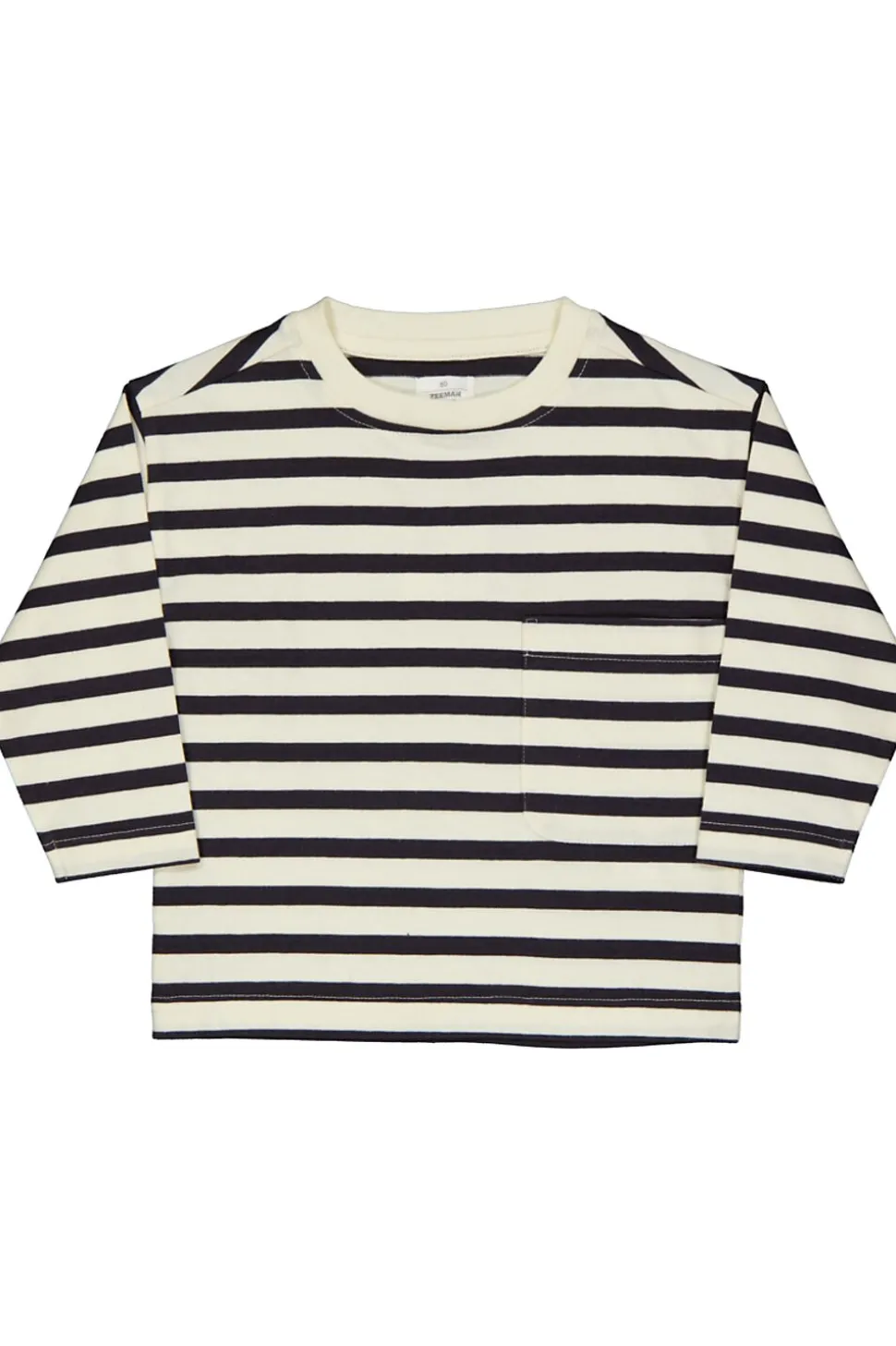 Ce T-shirt beige pour bébé a des rayures bleu foncé et des manches longues. Le coton doux est agréable à porter, pour que votre bébé puisse bouger librement. La coupe droite avec un col rond donne un tombé souple. La petite poche sur la poitrine apporte une touche simple qui convient à tout moment.