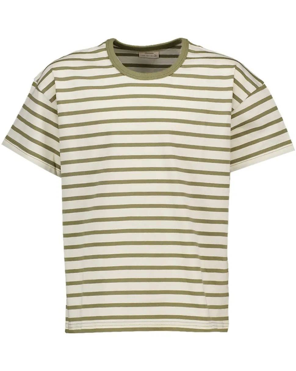 Ce t-shirt beige pour garçon a des manches courtes et un col rond. Le tissu en jersey simple est souple et léger, ce qui le rend agréable à porter par temps chaud. Le t-shirt a un motif rayé beige et vert. La coupe droite assure un bon confort, ce qui permet de le porter facilement toute la journée. Convient pour un usage quotidien lors des journées chaudes.