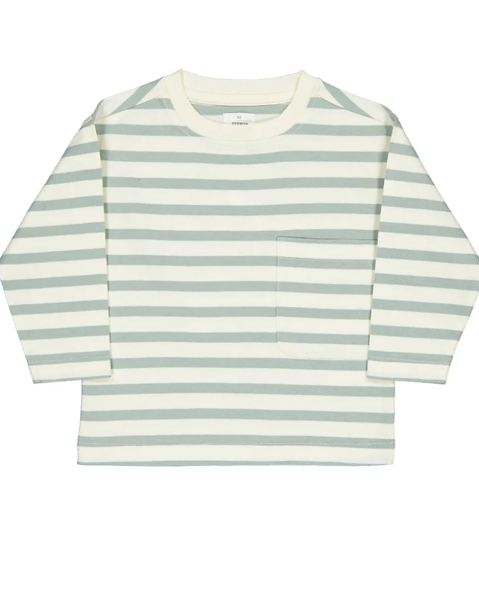 Ce petit T-shirt pour bébé a des rayures beiges et vertes et des manches longues. Il a ainsi un look calme et est agréable à porter. L’encolure ronde et la coupe droite offrent à votre bébé assez de liberté de mouvement pour jouer. La petite poche poitrine est pratique pour y glisser rapidement un petit chiffon. Le T-shirt est en coton, ce qui le rend doux pour la peau.