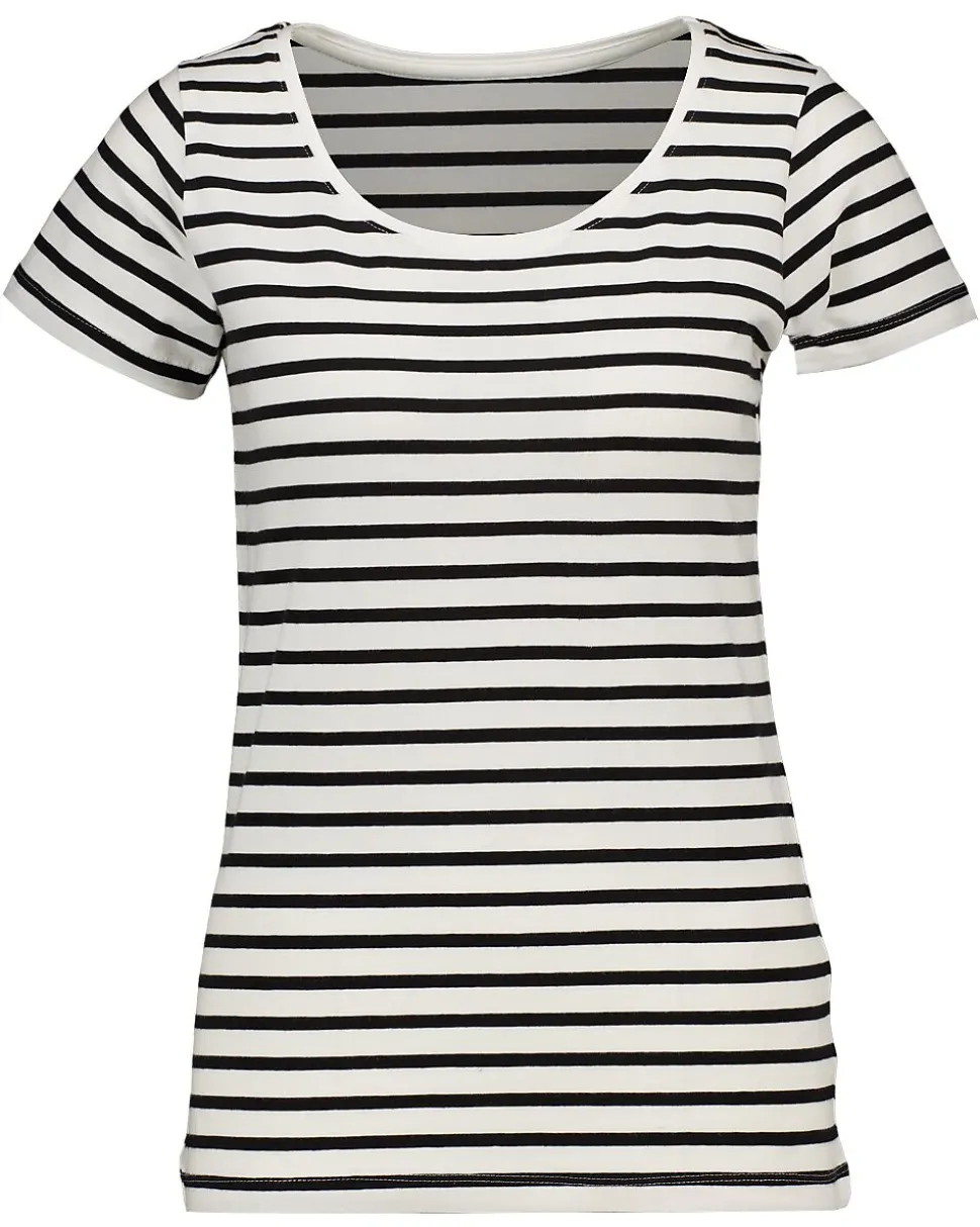 Ce t-shirt pour femme a un motif à rayures horizontales en blanc et noir et des manches courtes. L’encolure ronde et le tissu souple offrent un port confortable. Grâce au mélange de 80 % coton, 5 % élasthanne et 15 % coton recyclé, le t-shirt suit bien les mouvements du corps. Le tissu est doux sur la peau.